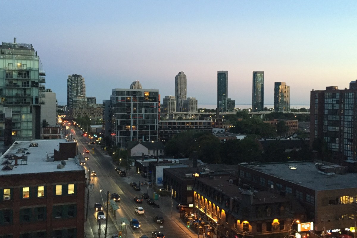 I’m sitting on my balcony, watching cars and people cross the intersection below. The sun is setting, but its one of the first warm evenings of the season and I am not yet ready to move indoors. The rain stopped a few minutes ago, and the saturated colours and sounds of the city surround me: the familiar trundle of the streetcar as it crosses the perpendicular tracks, the splash of traffic over puddles, laughter and conversation wafting upwards; the dark red brick that defines Toronto architecture, asphalt, concrete, glass towers and glassy blue water in the distance. This is my Toronto.